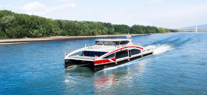 The Twin City Liner company operates a shipping line on the Danube from Vienna to Bratislava and back, aboard a high-speed catamaran.