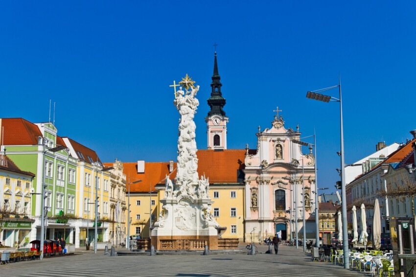 The Cathedral of the Assumption (Kathedralkirche Maria Himmelfahrt) dominates the city with its majestic Baroque façade and richly frescoed interior by Bartolomeo Altomonte. The Rathausplatz, the heart of the old town, is surrounded by Baroque palaces and dominated by the Trinity Column from 1782, while the 16th-century Town Hall flaunts an elegant Baroque façade topped by an octagonal tower with a modern 48-bell carillon installed in 2022.