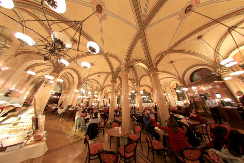 Aujourd’hui, il est surtout fréquenté par les touristes, qui viennent y déguster un bon gâteau ou des plats viennois typiques et admirer l’intérieur de ce lieu magnifique, orné de colonnes de marbre, d’arches et de lustres étincelants. Venez l’après-midi pour écouter du piano en guise de musique de fond.